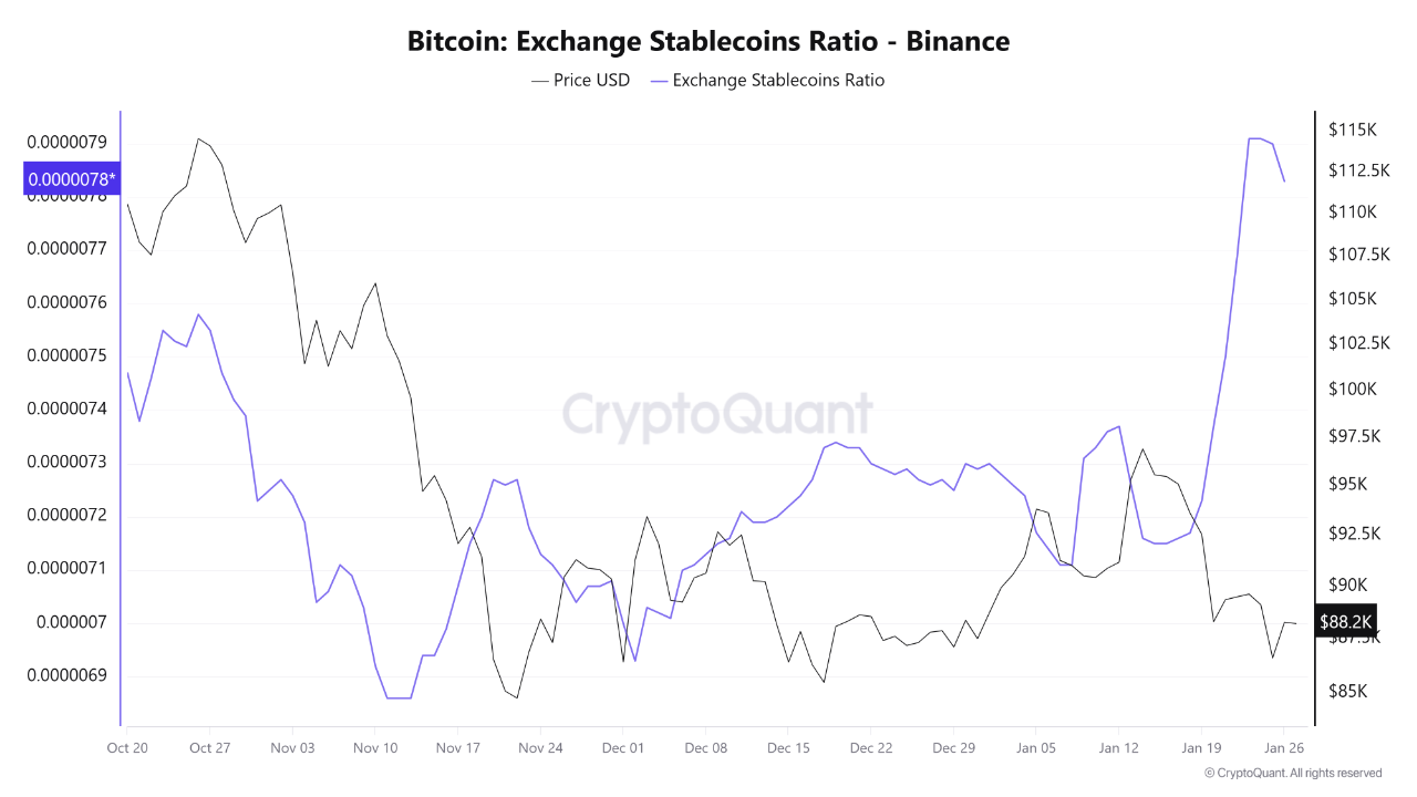 CryptoQuant flagged a recent spike in the Bitcoin-to-stablecoin ratio on Binance that appeared bullish at first glance. Under normal conditions, a rising ratio points to higher risk appetite and stronger buying power.