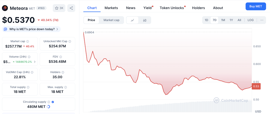 Consequently, Meteora’s price has experienced notable downward pressure. The token has fallen nearly 41% over the past week, trading around $0.5320 at press time.