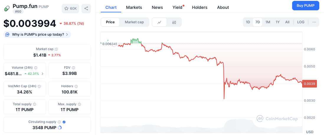 PUMP is next, with $41.57 million set to unlock. Its price fell 36.87% to $0.003994, extending its weekly downtrend. The token faces critical resistance between $0.0048 and $0.0063, where prior rebounds failed. Immediate support rests at $0.0036, with a breakdown risking further decline toward $0.0030.