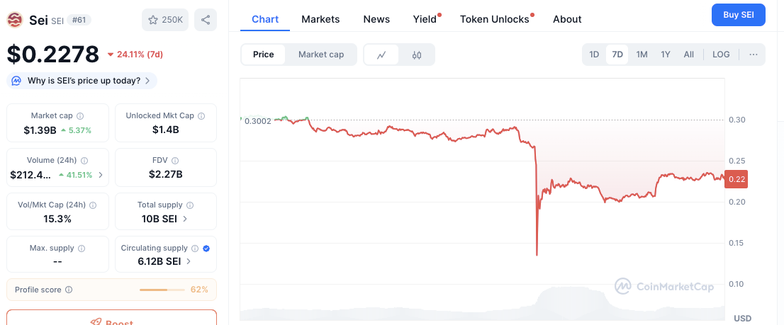 SEI’s upcoming $22.11 million unlock coincides with a 24.11% weekly drop to $0.22. The price is consolidating between $0.21 and $0.25 after sharp losses from $0.30. Trading volume has risen by 41.5%, suggesting potential accumulation. Sustained closes above $0.25 may enable a retest of $0.27–$0.29, while losing $0.21 could trigger a slide toward $0.19.