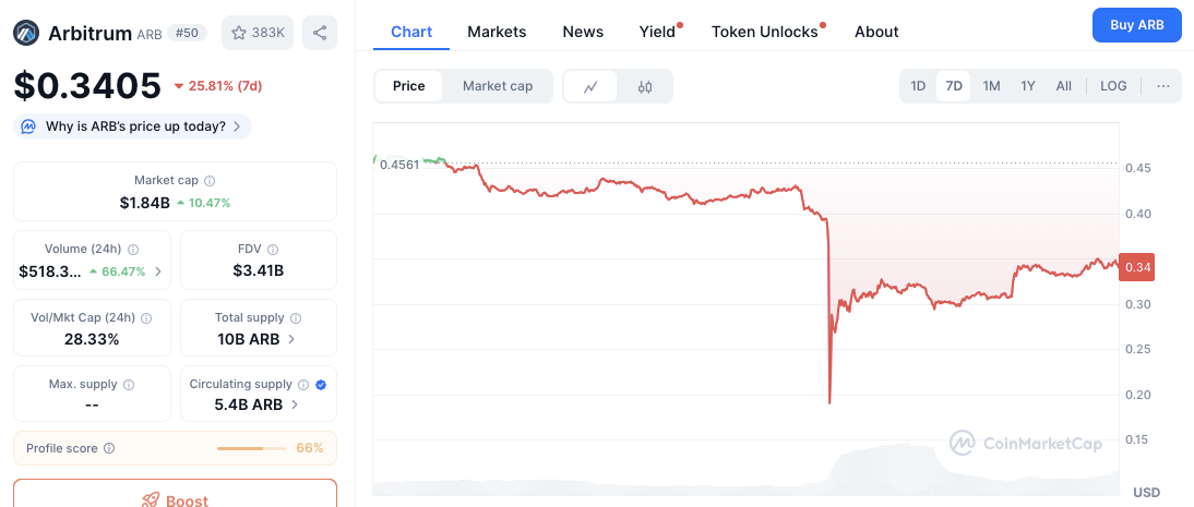 ARB’s 66.47% spike in daily volume indicates that accumulation may be forming near the lower range. However, any bullish reversal depends on a sustained breakout above $0.38.