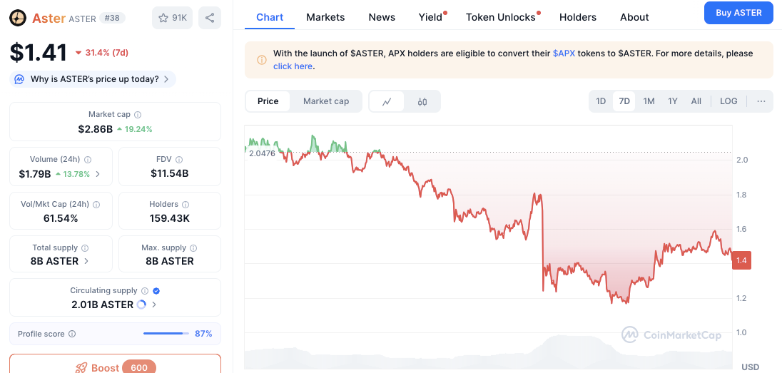 Additionally, investor repositioning following the APX-to-ASTER conversion has increased circulating supply to 2.01 billion tokens. Consequently, prices may remain under pressure unless ASTER regains $1.85, a key level for a potential trend reversal.