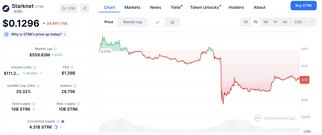 Starknet (STRK) will unlock $16.86 million worth of tokens amid a 24.49% weekly slide to $0.1296. The token struggled to regain footing after a midweek crash that pushed it below $0.11. Support is holding near $0.12, while resistance lies at $0.15.