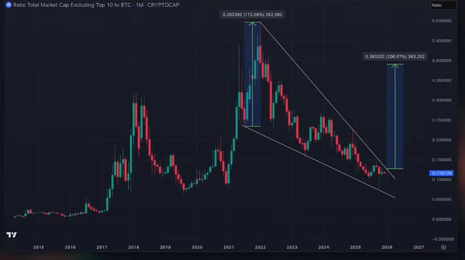 If this wedge breaks to the upside, the technical target sits near 0.40, meaning a 3x to 4x altcoin rally against Bitcoin.