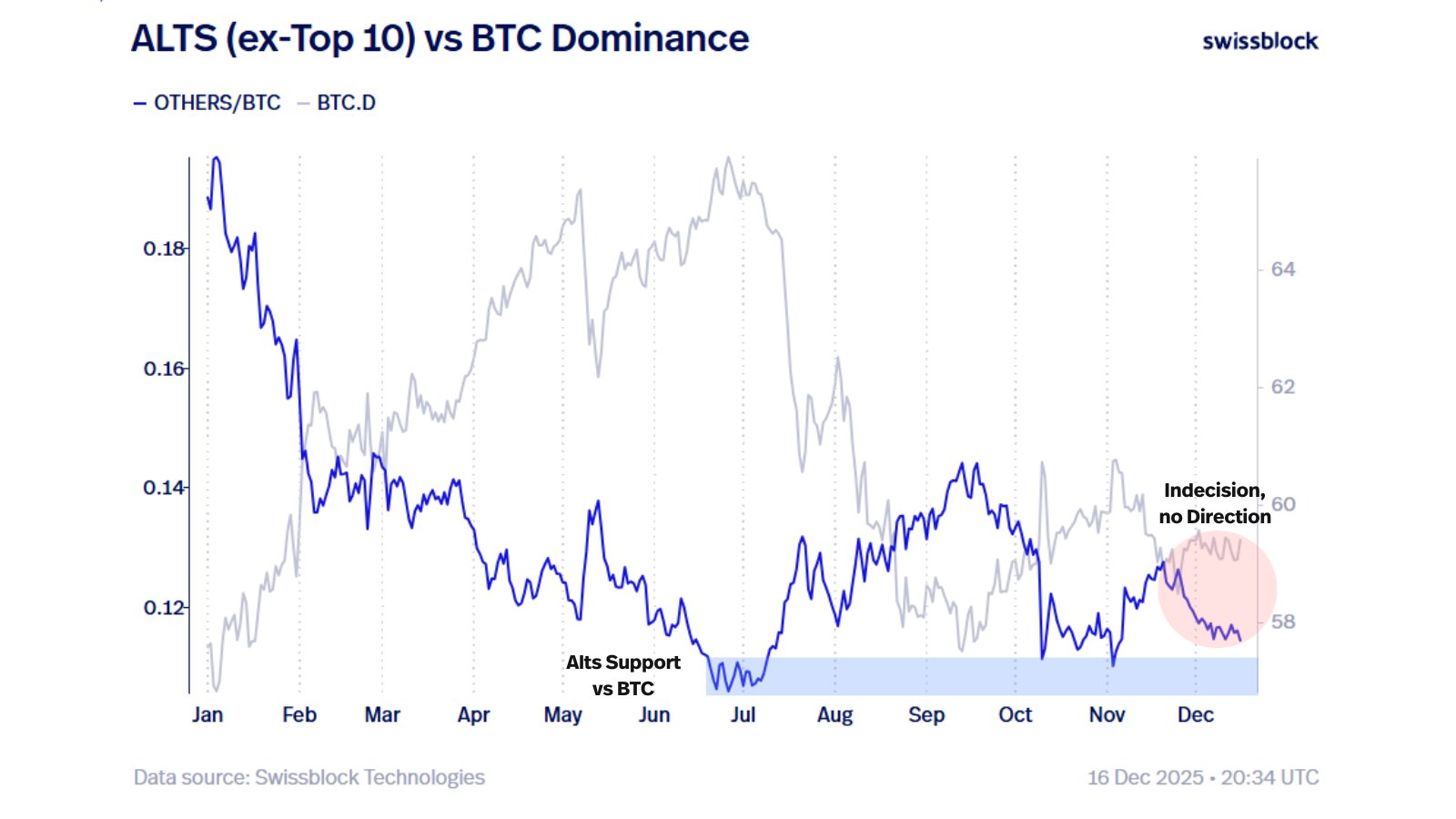 - Bitcoin dominance near 59% left most altcoins rangebound in December.