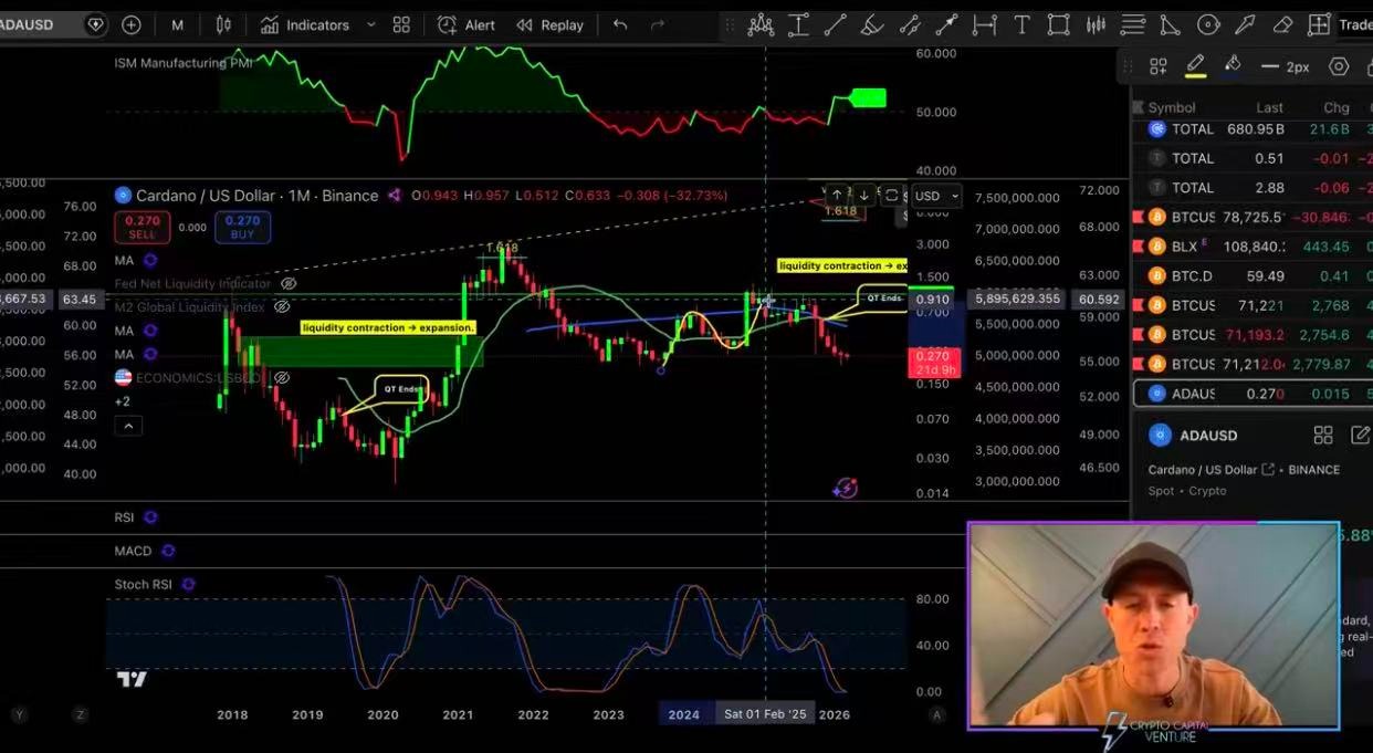Gambardello highlights that the monthly Relative Strength Index (RSI) on major crypto market indices and leading altcoins has reached deeply oversold territory. He explains that this reset mirrors prior cycle capitulations, when prolonged QT-induced liquidity drain caused multi-standard-deviation exhaustion.
