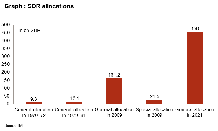 According to IMF data, the total SDR allocations stand at 660.7 billion (approximately US$943 billion as of recent IMF data), distributed across 190 member countries in proportion to their quotas, with the largest general allocation of SDR 456.5 billion (about US$650 billion) implemented in August 2021 to address global liquidity needs post-COVID.