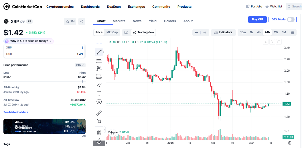 According to CoinMarketCap data, XRP trades around $1.42 as of March 13, 2026, rising from $1.37, with community optimism fueled by Ripple’s technical advantages, stablecoin growth, and global adoption narratives.