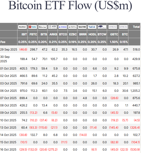 Bitcoin (BTC) price plunged to $104,000 today, rocked by a dual shock of macro fear and a massive flight from crypto-native products. The catalyst for the crash was a record-breaking $530.9 million net outflow from U.S. Spot Bitcoin ETFs on October 16.