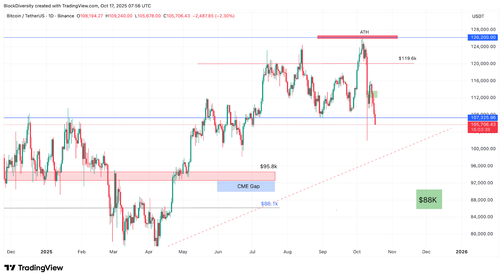Bitcoin has now lost several key support levels, including the 200-day SMA at $107,520. Analysts warn that further downside is possible: