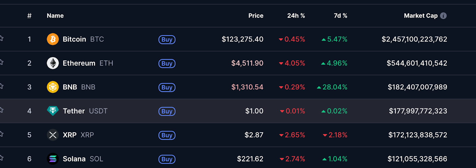 While BNB keeps climbing, the wider crypto market saw a pause in momentum. Bitcoin briefly touched a new high above $126,000 before slipping 1.4% to trade at $122,732. Other major altcoins, including XRP, Dogecoin, ADA, and Avalanche (AVAX), recorded losses between 3% and 5%.