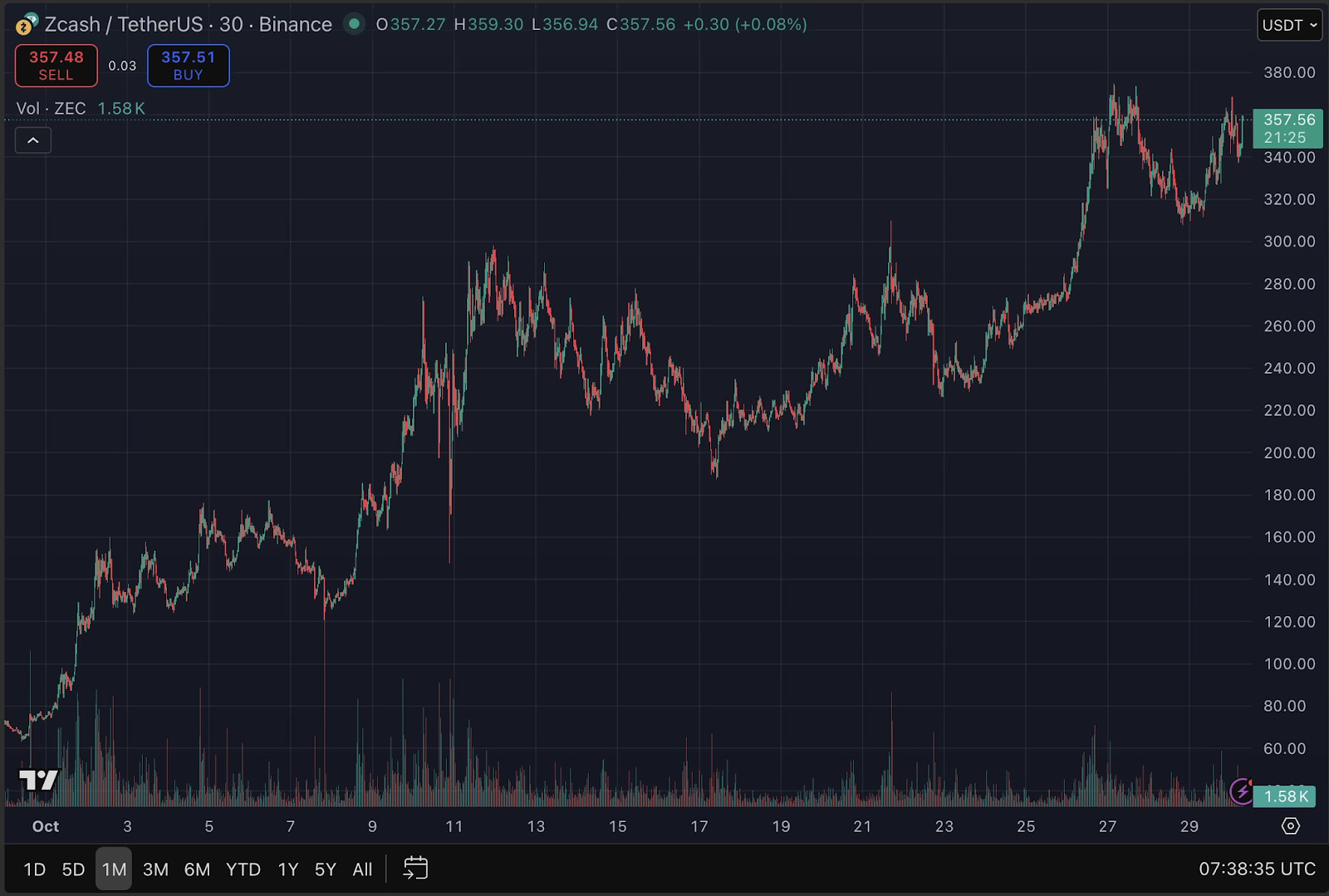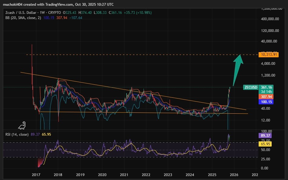 ZEC price is well positioned to reach a target of $10k, a price it once hit during its early rollout phase, fueled by its renewed demand. The mid-cap altcoin, with a fully diluted valuation of about $7.57 billion, has surged from trading below $40 in August to reach a recent local high of about $370.