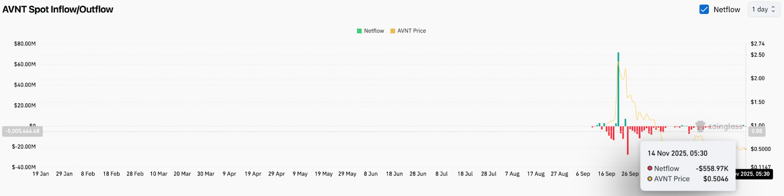 Avantis price today trades near $0.505, slipping after another rejection at the descending trendline that has capped every rally this month. The token continues to coil inside a narrowing structure, but flows remain negative and the EMA stack sits firmly above price. This keeps sellers in control as AVNT approaches a major demand zone.
