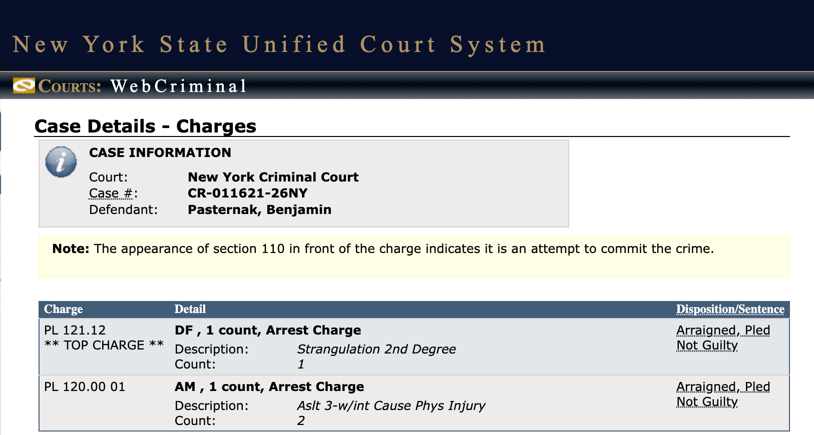 - Benjamin Pasternak is charged in New York with assault, but he denies all allegations.
