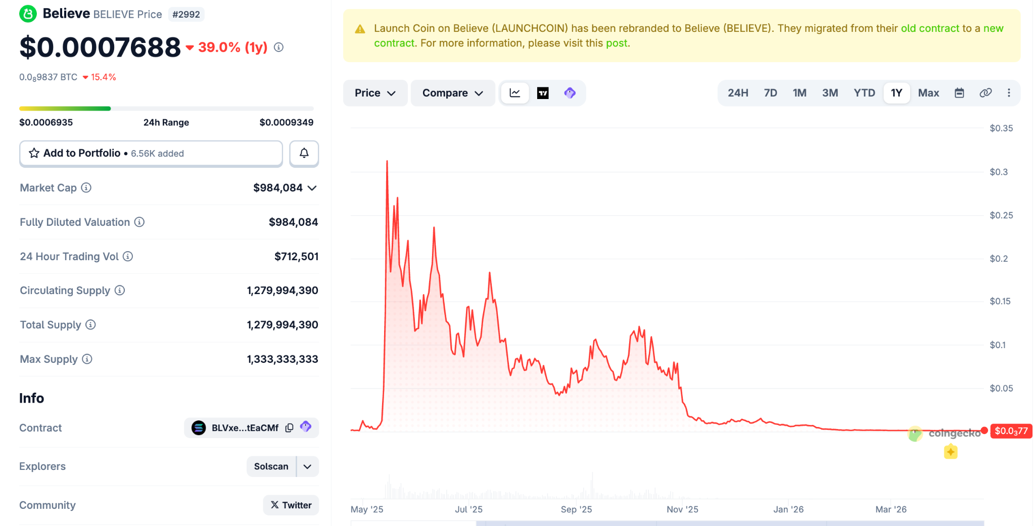 Market data shows the BELIEVE token has dropped to about $0.00076. This represents a decline of more than 99% from its peak of $0.3569 recorded in May 2025. Trading activity also fell sharply following reports of the indictment.
