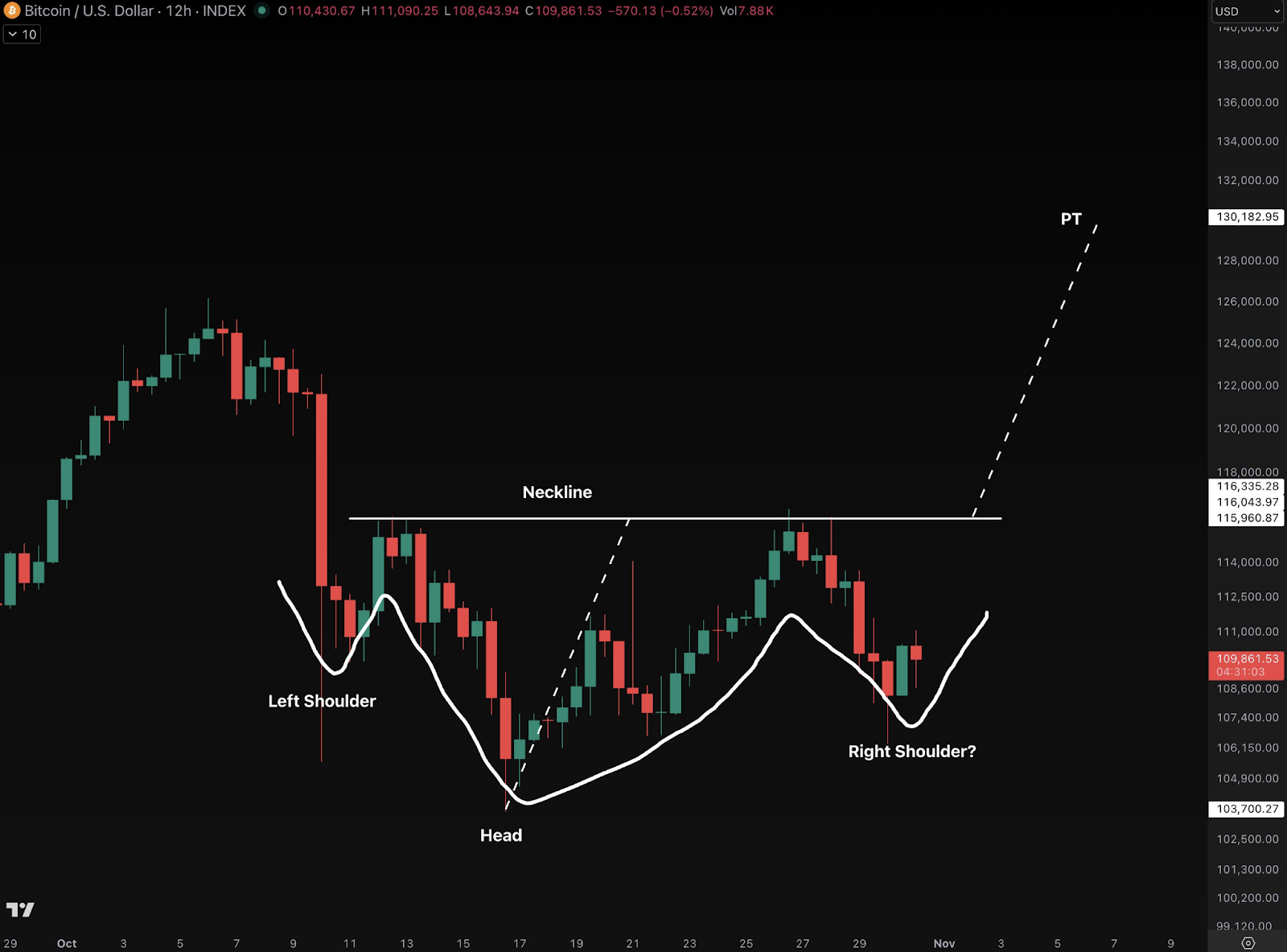 Market observer GandalfCrypto identified an inverse head and shoulders pattern forming on Bitcoin’s chart. This pattern signals a potential bullish reversal.