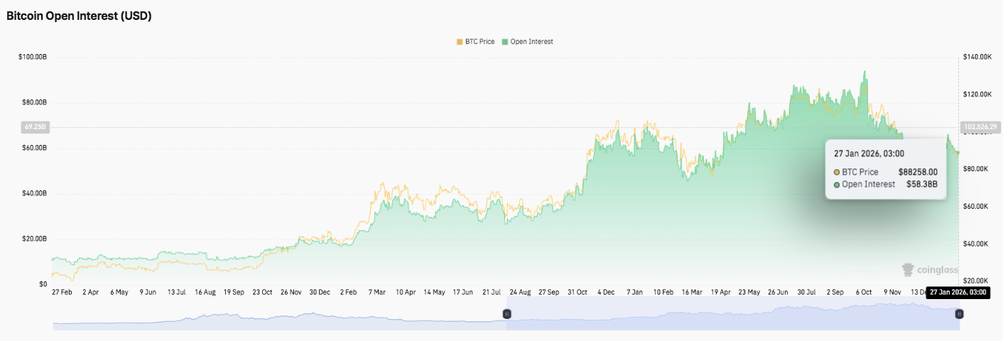 Derivatives data provides additional insight. Open interest expanded steadily throughout 2025 alongside rising prices. Periodic drawdowns accompanied corrections, indicating leverage flushes rather than participation loss. Recently, open interest slipped toward $58 billion. Consequently, traders appear to unwind positions after heightened volatility, not exit the market entirely.