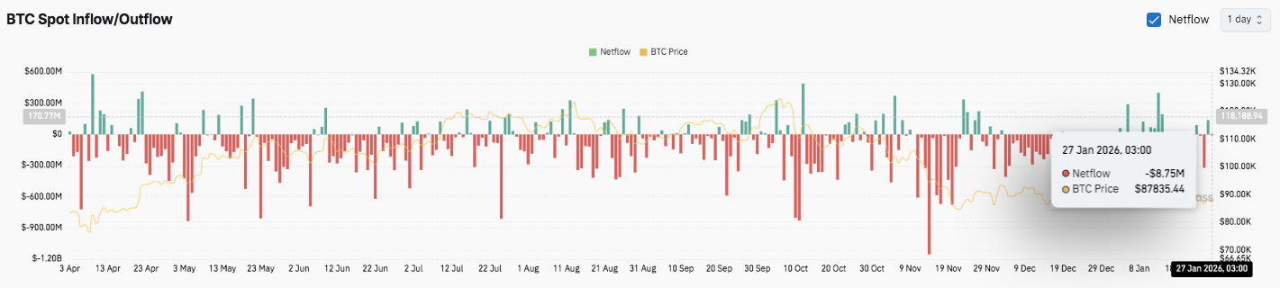 Spot flows, however, paint a more defensive picture. Outflows consistently outweighed inflows during recent sessions. Several sharp outflow spikes coincided with price pullbacks. Moreover, late January recorded net outflows near $88.75 million while Bitcoin traded around $87,800. That behavior reinforced cautious sentiment and fragile demand.
