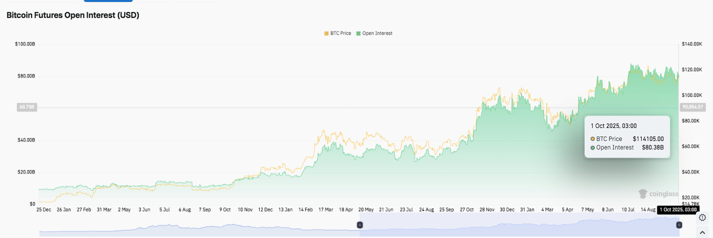 Bitcoin futures open interest has surged throughout 2025, rising from under $20 billion early this year to over $80 billion in October. This growth indicates increased speculative activity and growing institutional participation.