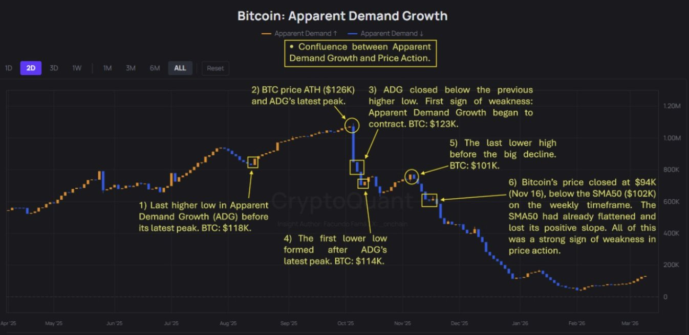 On-chain data shows weakening momentum ahead of the recent pullback, with apparent demand growth turning negative before the broader decline, signaling softer market participation. However, not all indicators point lower.