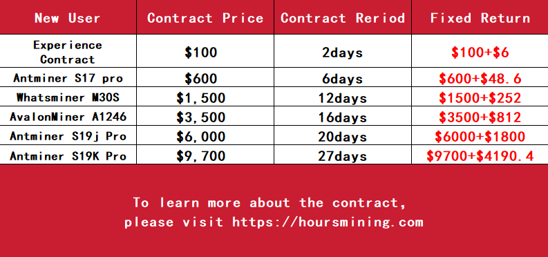 ② Purchase a Cloud Mining Contract: 8HOURSMining offers a variety of high-performance, high-yield contracts, each with varying hashrates and terms, resulting in varying returns.