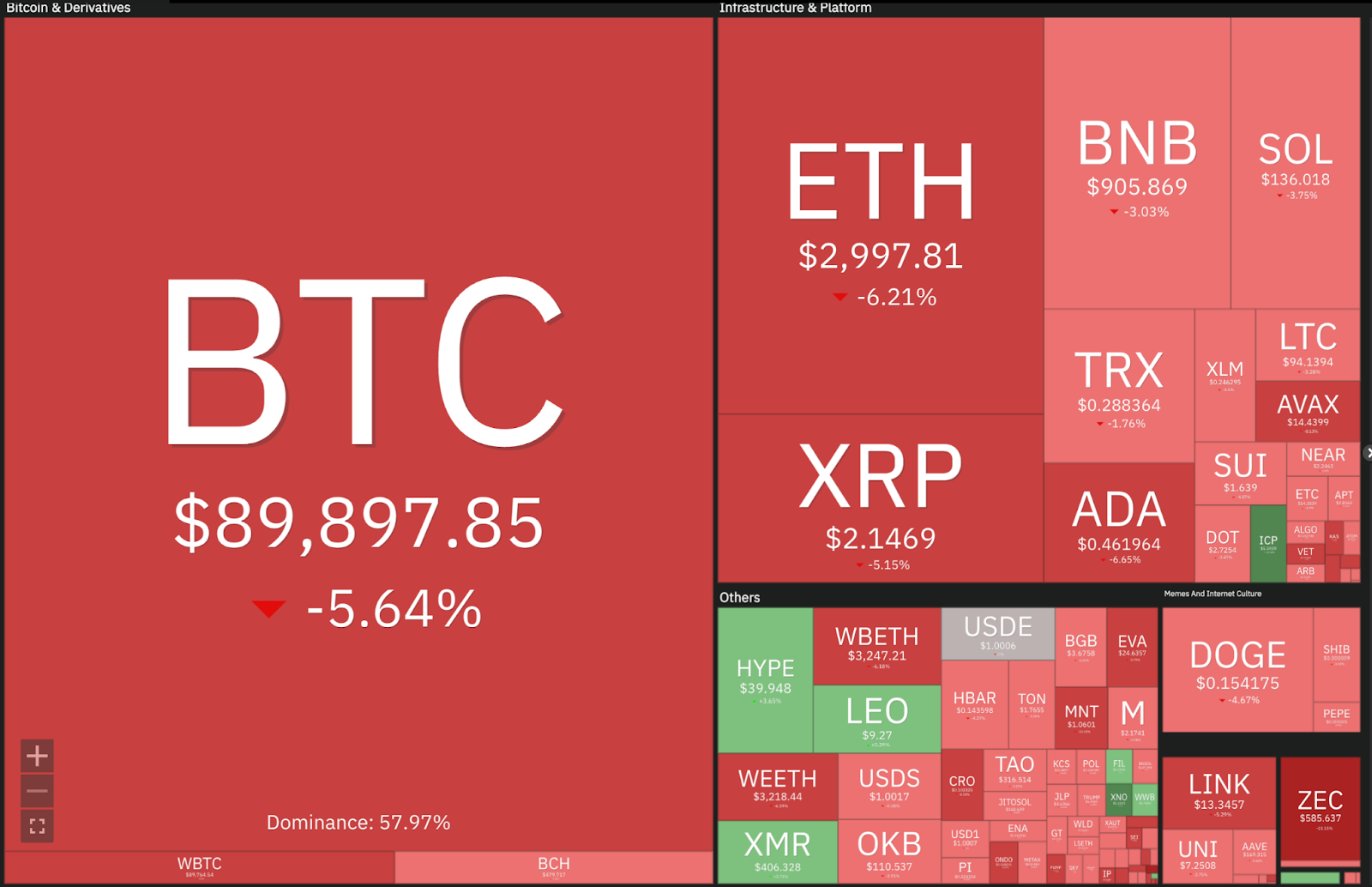 Major altcoins also suffered. Ethereum slid to $3,011, down 23% in a month, while Solana fell 27% to $135. XRP remained comparatively resilient, declining just 8% to $2.16.