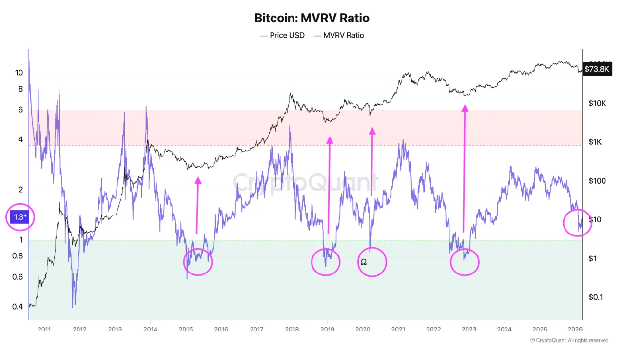 The next level near $85,000 marks the upper band of the same metric. This range has already been rejected twice, once in October 2025 and again in mid-January when Bitcoin moved from $80,000 to $98,000 before pulling back.