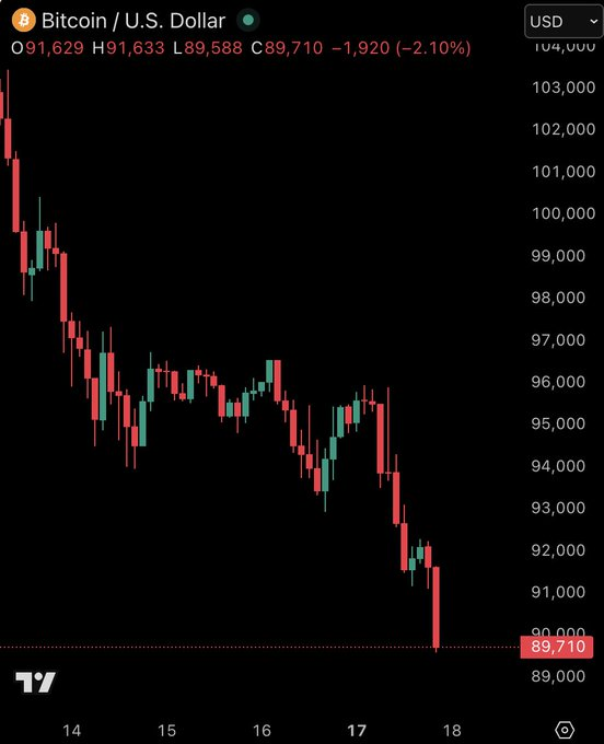- Bitcoin dips under $90K with a 29% drawdown from its all-time high.