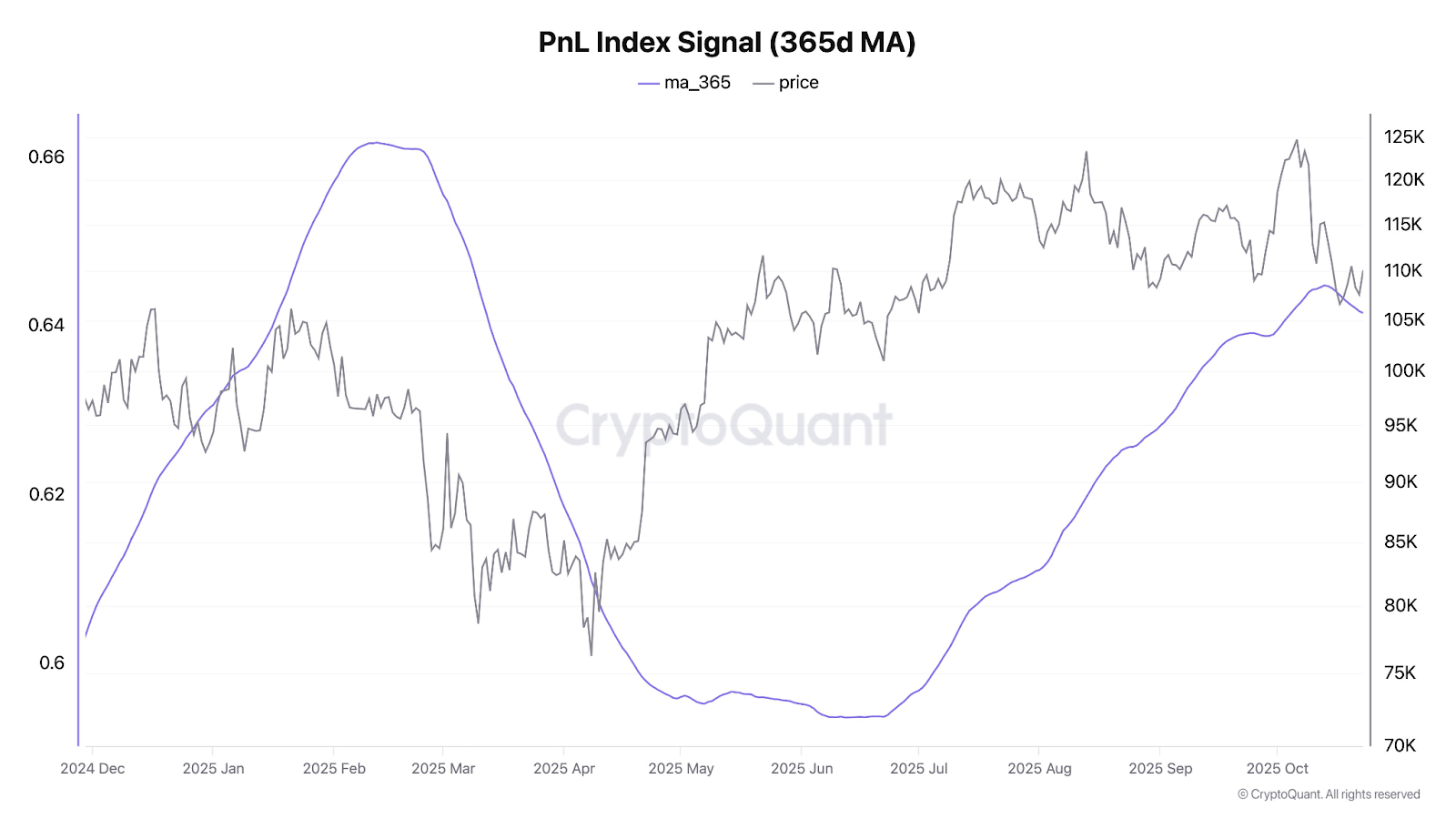 Think of market momentum like water pressure: strong inflows push prices higher, but weakening pressure makes the current level harder to sustain. CryptoQuant CEO Ki Young Ju points to exactly this scenario unfolding now. He highlights the Bitcoin PnL Index – a metric tracking aggregate investor profitability and momentum, which has started to plateau in October after recovering earlier in the year.