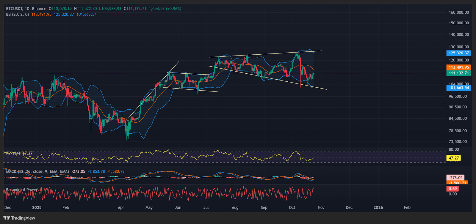 Looking at the daily chart, Bitcoin’s current consolidation phase near $111,000 reflects this uncertainty. The price remains trapped within a falling channel established since the rejection from $126,000 in mid-September.
