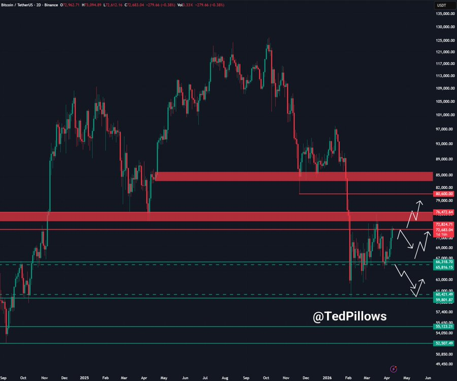 - Ted warns the rebound near $73K may end in a reversal after one more push.