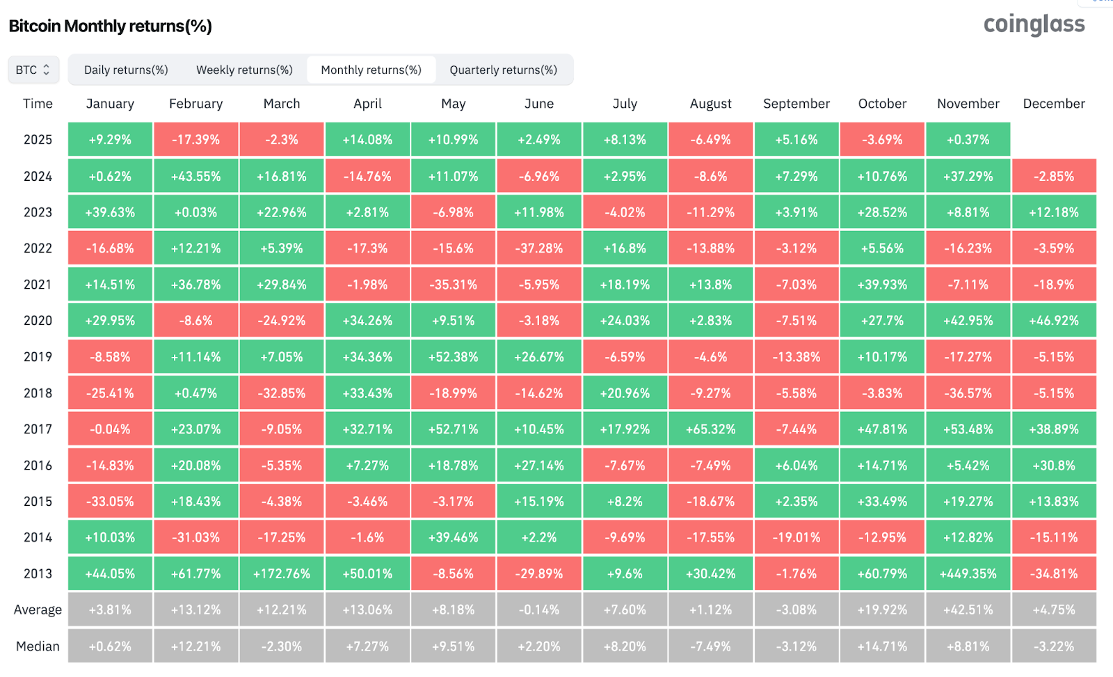 October’s reversal surprised traders who view it as Bitcoin’s historically strongest month. Coinglass data show a consistent seven-year record of gains during October, averaging more than 20% monthly returns. This year, that trend broke sharply as the digital asset fell from its all-time high of $126,142 to lows near $104,782 following the tariff shock.