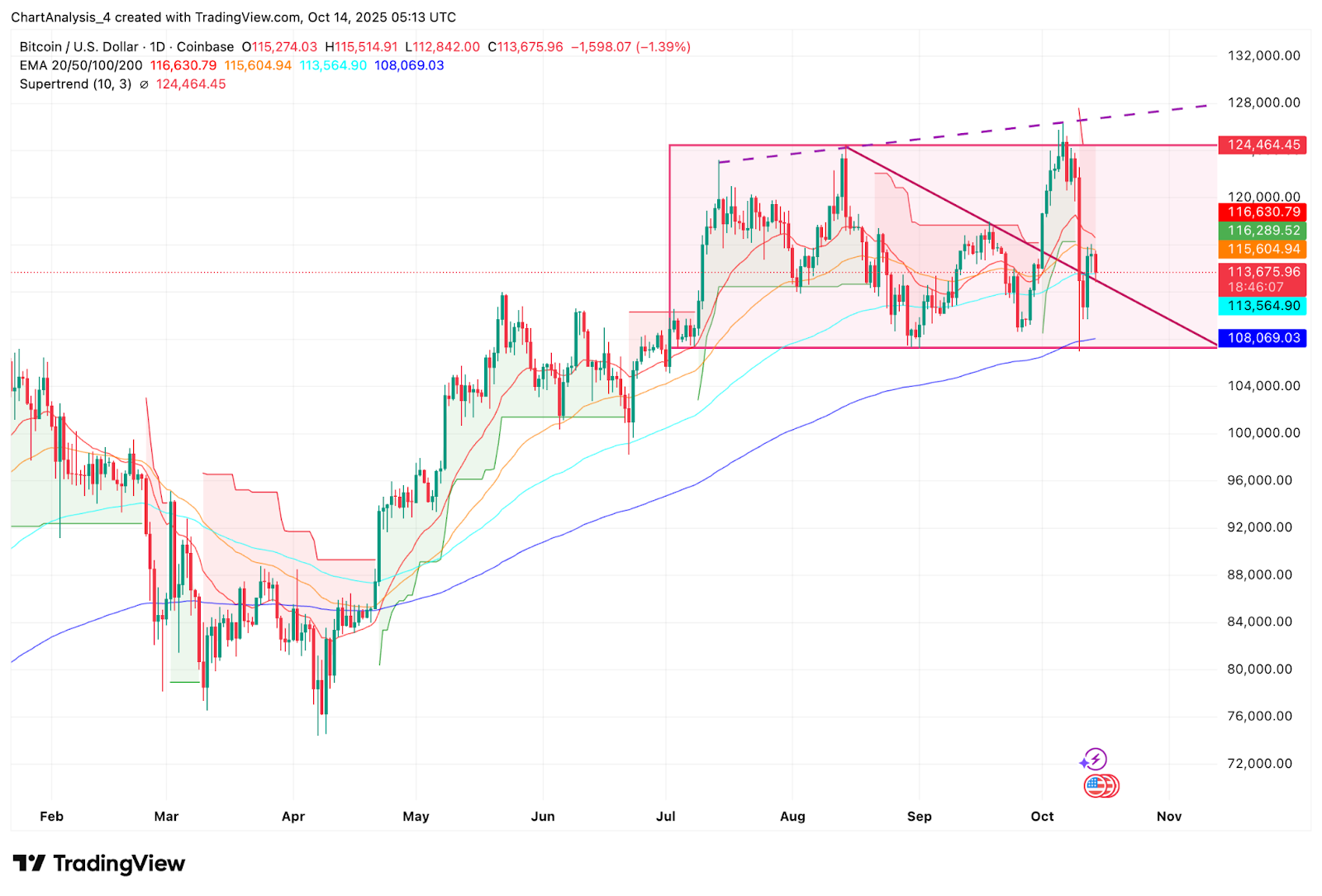 Bitcoin price today trades near $113,700, consolidating after a sharp pullback from the $124,000 resistance zone. The selloff found footing near the $113,500 level, aligning with the 100-day EMA and a critical trendline support that has contained every major correction since May. Bulls now face a test to reclaim $116,500 and restore momentum before deeper downside levels come into play.