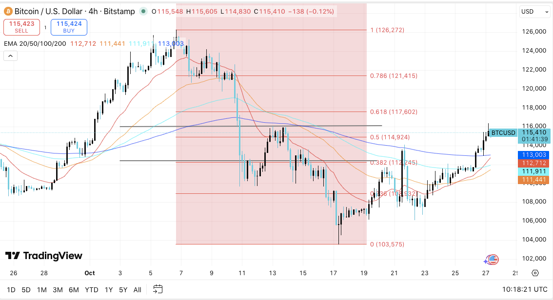 Bitcoin (BTC) is showing renewed strength after rebounding from the $103,575 level, marking a steady recovery in recent sessions. The cryptocurrency has regained major moving averages and is currently testing the 200-EMA region near $115,900. This marks an important inflection point where bulls aim to confirm a mid-term trend reversal.