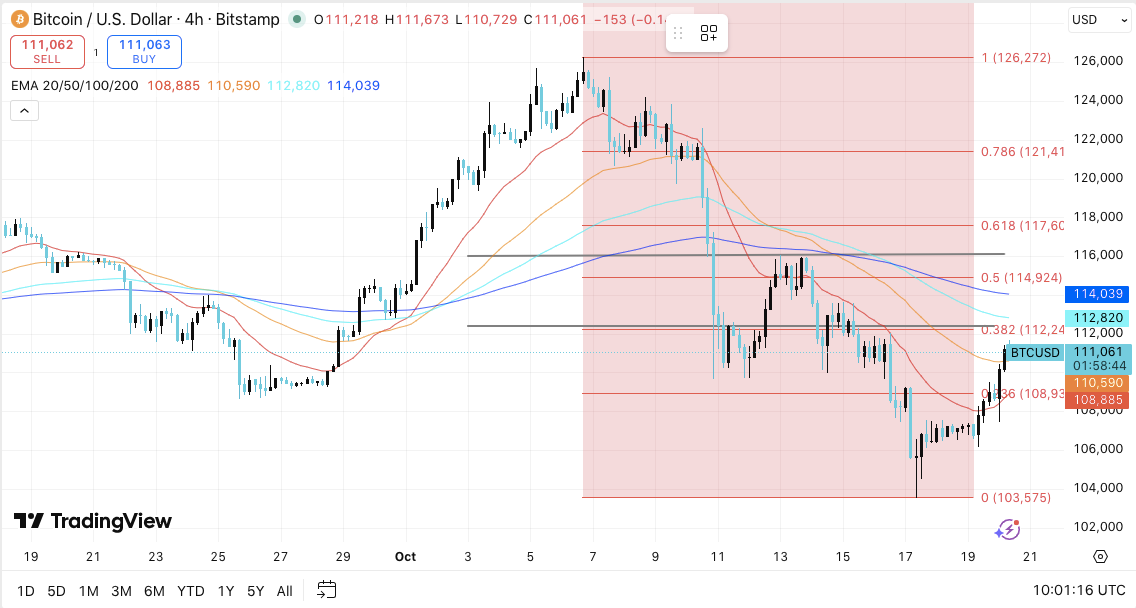 Bitcoin has climbed above its short-term exponential moving averages, signaling a shift in near-term sentiment. The price is now testing resistance near $111,000, just below the 38.2% Fibonacci retracement at $112,240. A strong close above this level could trigger further upside toward $114,900 and $117,600. These targets align with the 100-day and 200-day EMAs, zones that often act as critical resistance in corrective phases.