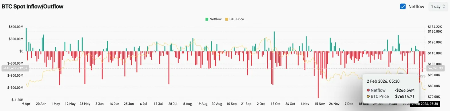 Coinglass data shows $266.54 million in spot outflows on February 2, marking one of the largest single day distributions since the November correction. The magnitude of selling reflects panic rather than orderly repositioning.
