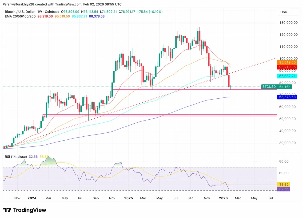 The $74,000 to $78,000 zone represents major horizontal support that held during the 2024 consolidation. A weekly close below this level would shift the macro structure from correction to potential trend reversal.