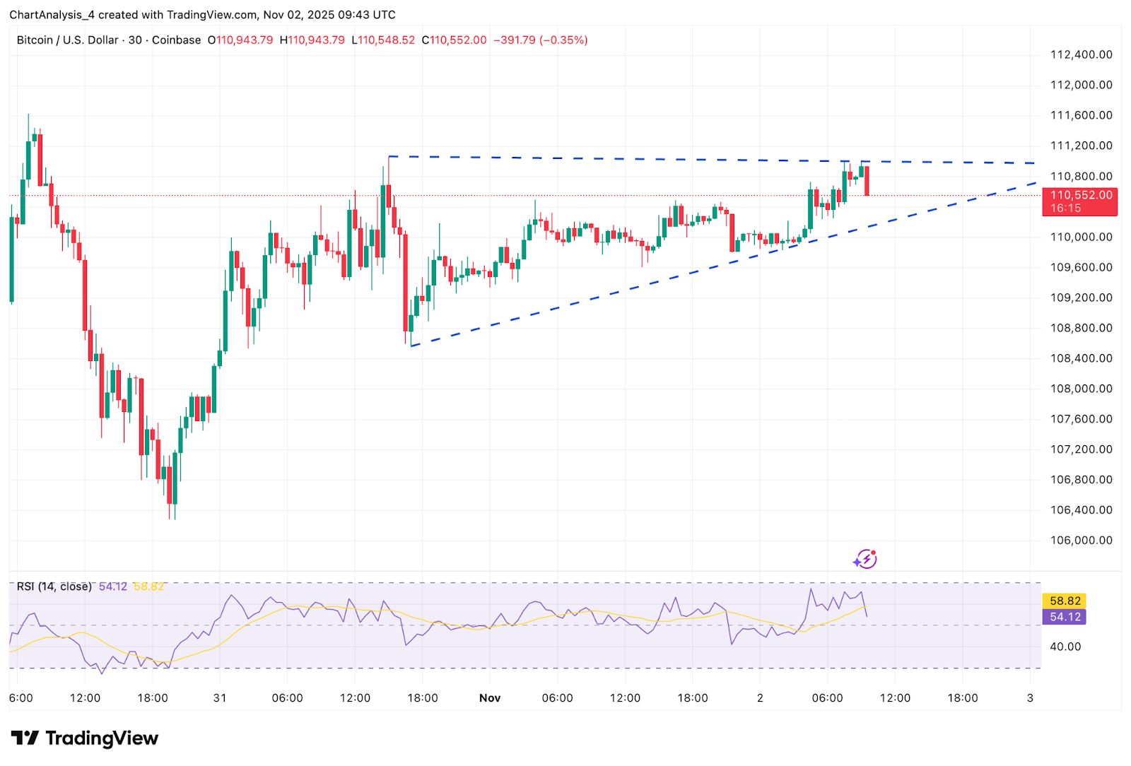 RSI on the 30-minute chart sits around 54, showing balanced momentum with a slight bullish bias. The structure of higher lows supports the idea of gradual accumulation beneath resistance.