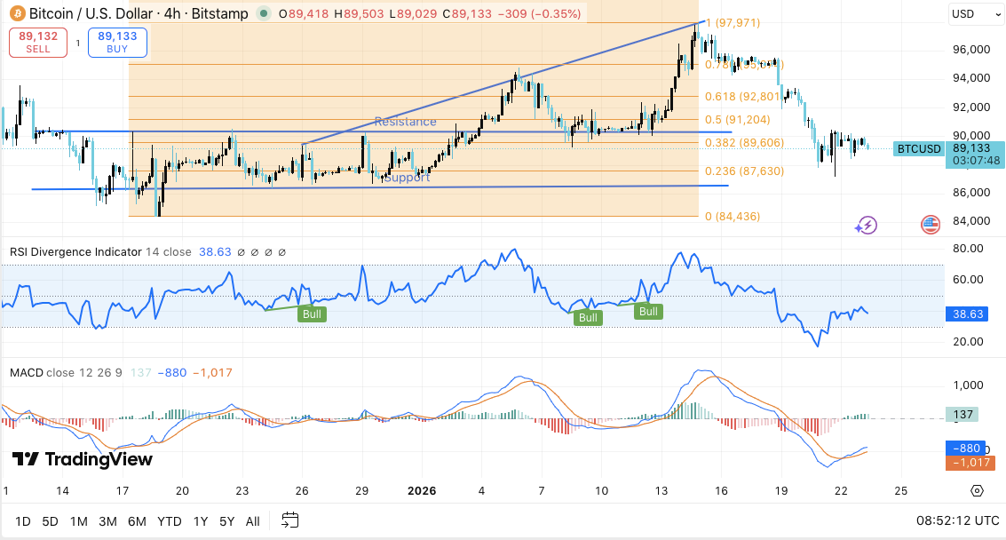 Bitcoin continues to build a base between key levels that traders often use to define the next swing. The market now sits between $87,630 as a near-term floor and $89,600 as the first recovery hurdle.