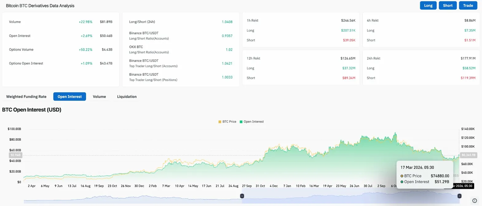 Open interest grew 2.69% to $50.46B as volume rose 22.98% to $81.89B. Options volume jumped 50.22% to $4.43B reflecting heavy activity around the squeeze event. The Binance long/short ratio sits at 0.9357 for accounts and 1.04 for top trader accounts, nearly flat on both sides. Top trader positions at 1.0033 shows institutional positioning is essentially neutral despite the retail long bias visible in the account ratios.