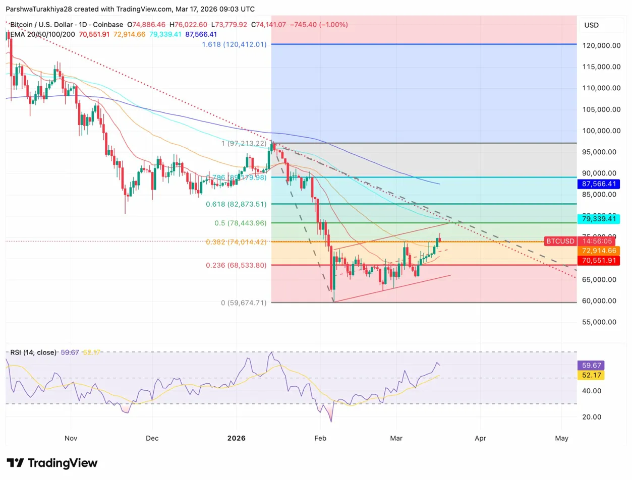 • Bearish case: Failure to reclaim $74,400 on a sustained basis sends price back toward the 0.236 Fibonacci at $68,533. A hawkish Fed outcome or fresh Hormuz escalation would accelerate the move, putting the February lows near $59,674 back in play.