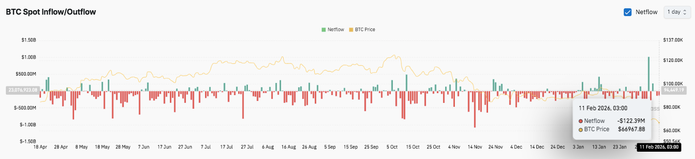 Besides that, spot flow data shows persistent net outflows across several months. Red bars consistently outweigh green inflows, reflecting distribution pressure. Significantly, February 11 recorded a $122 million net outflow, reinforcing cautious sentiment.