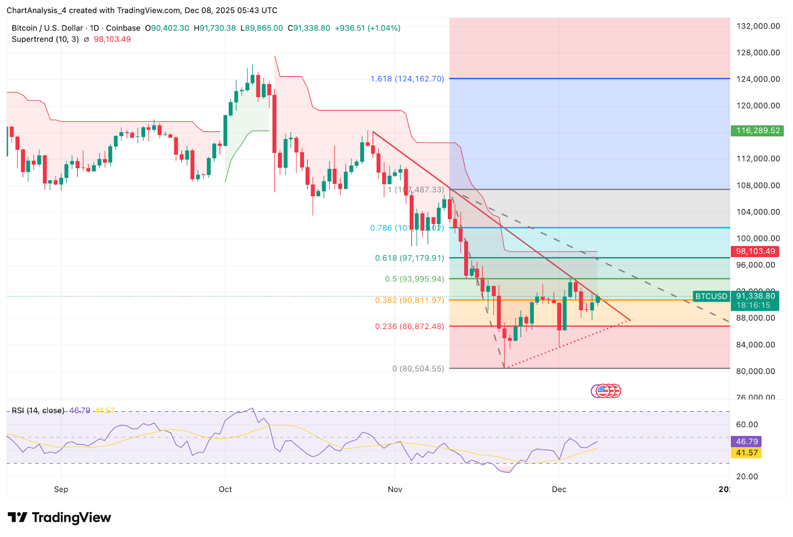 Bitcoin price today trades near $91,300 after recovering from the early December low near $85,000, but the rebound remains capped beneath a declining trendline that has rejected every upside attempt since late October. The recovery comes as traders anticipate the Federal Reserve’s final rate decision of the year and a spike in jobless claims that could influence the policy outlook.