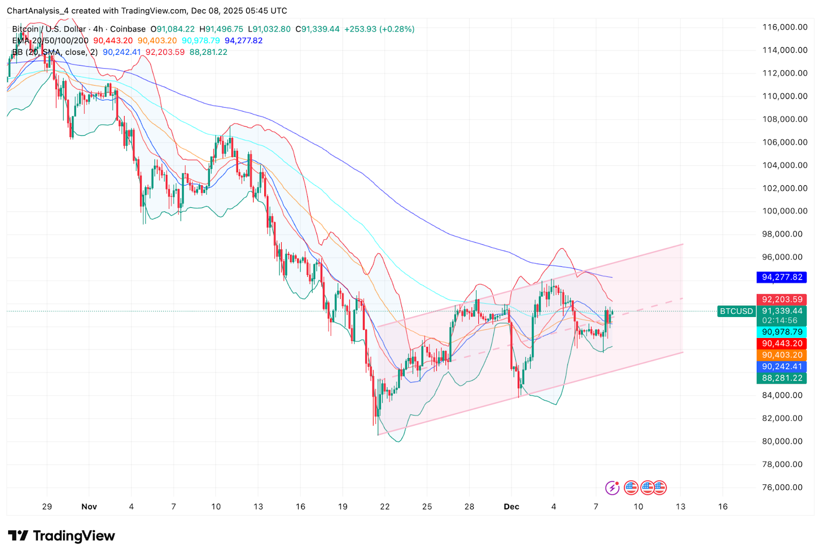 On the 4-hour chart, Bitcoin is attempting to build a base above a rising channel that has guided price since late November. Intraday momentum has improved, with price recovering above the 20-day EMA at $90,403 and testing the 50-day EMA at $90,978. The 100-day EMA at $92,203 marks the immediate barrier, while the 200-day EMA at $94,277 remains the level that would define a legitimate shift in trend direction.