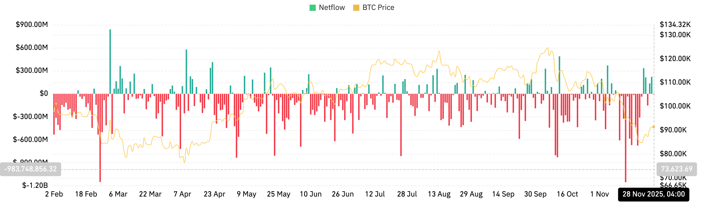 - Bullish case: A close above $93,224 turns momentum positive and opens a move toward $97,074, followed by $101,571. That would confirm the accumulation trend and signal a broader recovery.