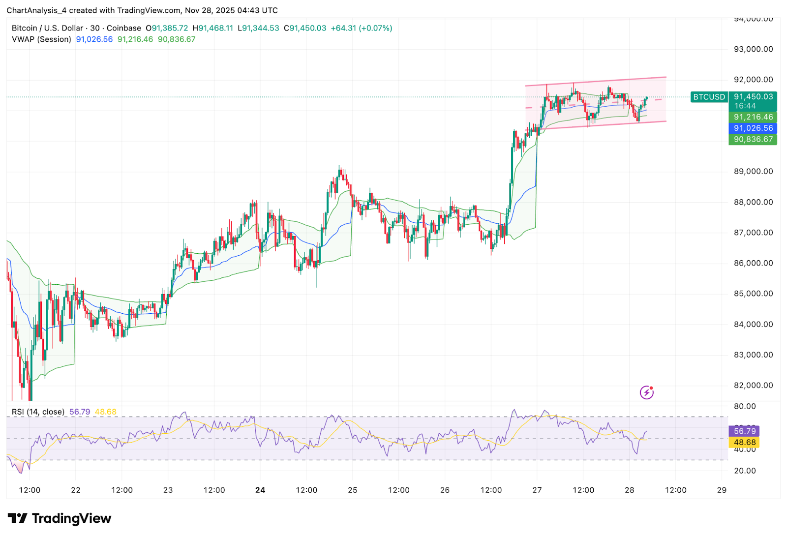 When spot outflows ease and accumulation accelerates, price typically begins to form a base. This dynamic is visible in the short-term structure. Bitcoin has tightened inside a narrow upward channel on the 30 minute chart, with VWAP support at $91,026 holding consistently. A series of higher lows on intraday candles shows early signs of stabilization.