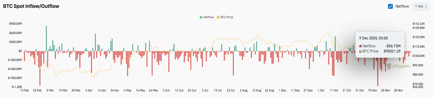 Spot flows tell a different story. Persistent outflows dominated recent months and signaled caution among long-term holders. Outflows reached $56.7 million on December 9 and maintained a bearish tilt across several weeks. Hence, investors continue to react defensively during each consolidation.