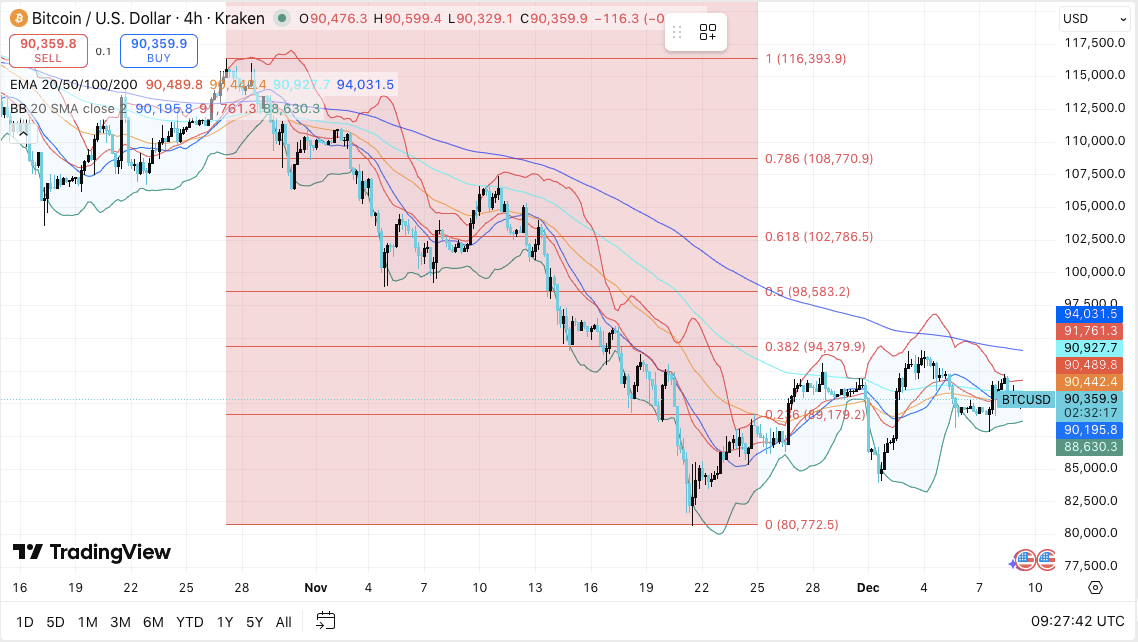 Bitcoin continues to trade between $89,200 and $92,700 during a period of compressed volatility. The range sits beneath a cluster of short-term EMAs that capped every recent bounce.