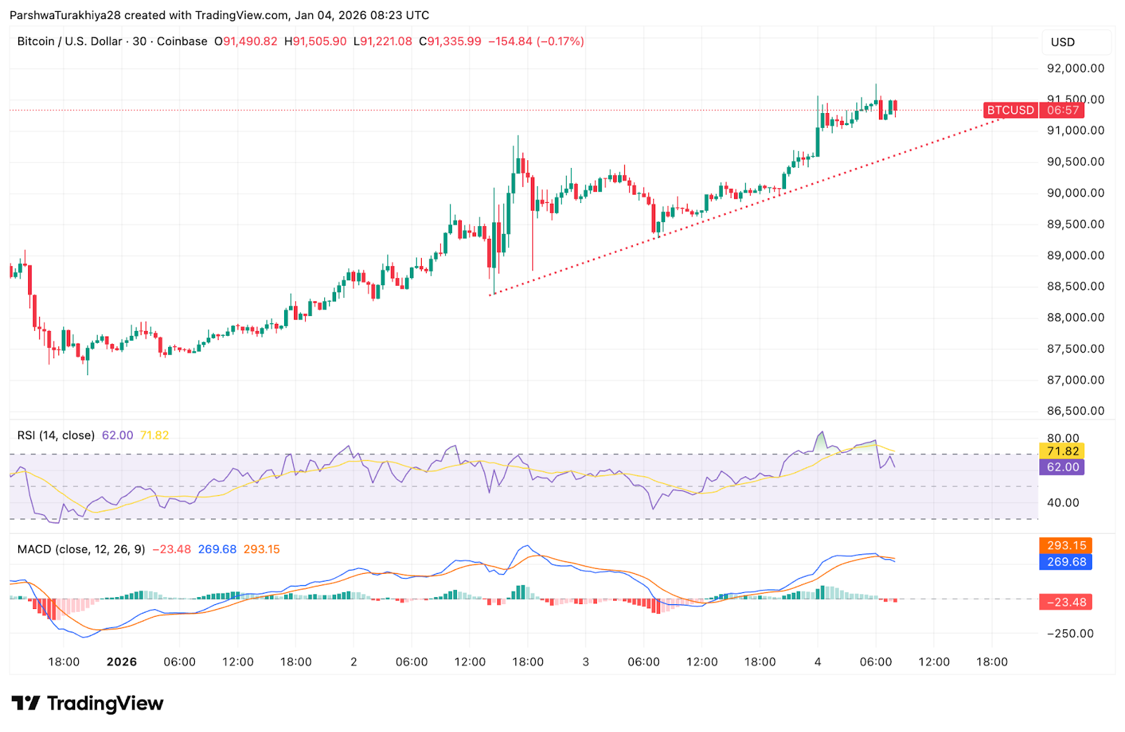 Bitcoin price today trades near $91,300 as the market moves into Jan 5 locked inside a tightening structure. Buyers are defending a rising short-term trendline, while sellers continue to cap upside below a descending resistance line that has defined price action since November. The result is compression, not momentum, with direction likely decided early this week as U.S. markets reopen.