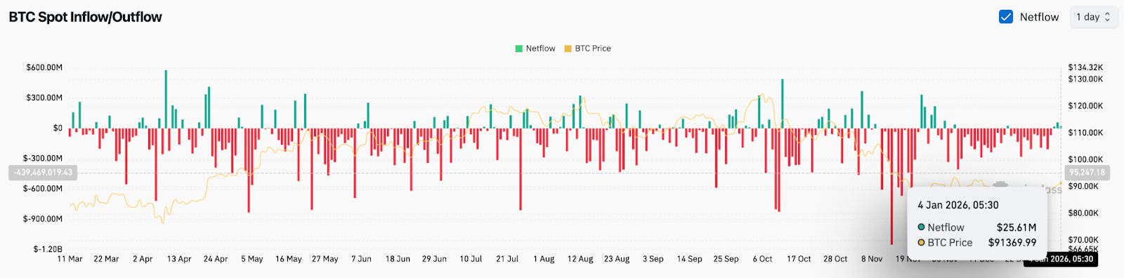 Spot exchange data shows selling pressure has eased compared to late November and early December. While netflows remain negative on a broader lookback, the most recent session recorded a modest $25.6 million net inflow, suggesting that aggressive distribution has paused.